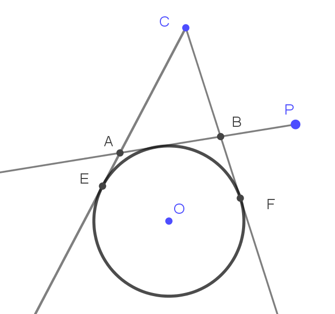 Megoldás. Legyen az adott szög csúcsa \(\displaystyle C\), a szögszárak az \(\displaystyle e\) és \(\displaystyle f\) félegyenesek. Vegyünk egy olyan egyenest és ezzel együtt háromszöget, amely megfelel a feladat feltételének. Messe a behúzott egyenes az \(\displaystyle e\) szögszárat az \(\displaystyle A\), az \(\displaystyle f\) szögszárat pedig a \(\displaystyle B\) pontban. Majd rajzoljuk meg az \(\displaystyle ABC\) háromszög \(\displaystyle AB\) oldalához tartozó hozzáírt \(\displaystyle k_C\) kört. Az érintési pontok \(\displaystyle E\), illetve \(\displaystyle F\).