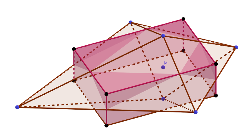 B. 5146. Adott egy egységnyi térfogatú \(\displaystyle T\) téglatest, és belsejében egy \(\displaystyle M\) pont. Tükrözzük az \(\displaystyle M\) pontot a téglatest lapsíkjaira, a kapott \(\displaystyle 6\) képpont konvex burka legyen \(\displaystyle D\). Határozzuk meg a \(\displaystyle T\cap D\) test térfogatát.