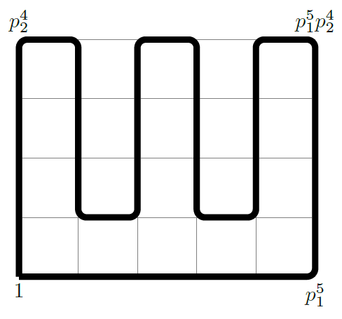 $$\begin{multline*} 1,p_1,p_1^2,\dots,p_1^{\alpha_1}, p_1^{\alpha_1}p_2, \dots, p_1^{\alpha_1}p_2^{\alpha_2},p_1^{\alpha_1-1}p_2^{\alpha_2},p_1^{\alpha_1-1}p_2^{\alpha_2-1},\dots,p_1^{\alpha_1-1}p_2,p_1^{\alpha_1-2}p_2,p_1^{\alpha_1-2}p_2^2,\dots,p_1^{\alpha_1-2}p_2^{\alpha_2},\\ p_1^{\alpha_1-3}p_2^{\alpha_2},\dots,p_1^{\alpha_1-3}p_2,\dots,p_1p_2,\dots,p_1p_2^{\alpha_2},p_2^{\alpha_2}, \dots, p_2. \end{multline*}$$Példaként \(\displaystyle \alpha_1=5,\alpha_2=4\) esetén a következőképpen néz ki a sorrend (a vastagított vonal mutatja, hogy milyen sorrendben kerülnek a körvonalra az osztók):