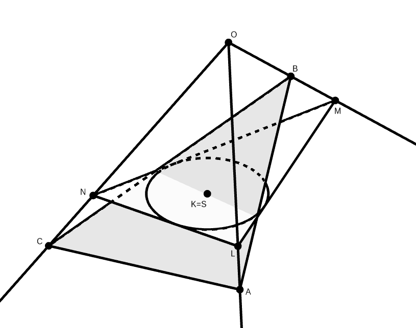 B. 5171. Az \(\displaystyle OLMN\) és \(\displaystyle OABC\) tetraéderek úgy helyezkednek el, hogy az \(\displaystyle A\), \(\displaystyle B\) és \(\displaystyle C\) pontok rendre az \(\displaystyle OL\), \(\displaystyle OM\) és \(\displaystyle ON\) félegyenesek pontjai. Az \(\displaystyle LMN\) háromszög beírt körének középpontja egybeesik az \(\displaystyle ABC\) háromszög súlypontjával. Mutassuk meg, hogy az \(\displaystyle OLMN\) tetraéder térfogata legalább akkora, mint az \(\displaystyle OABC\) tetraéderé. Mi a feltétele annak, hogy a két tetraéder térfogata egyenlő legyen?