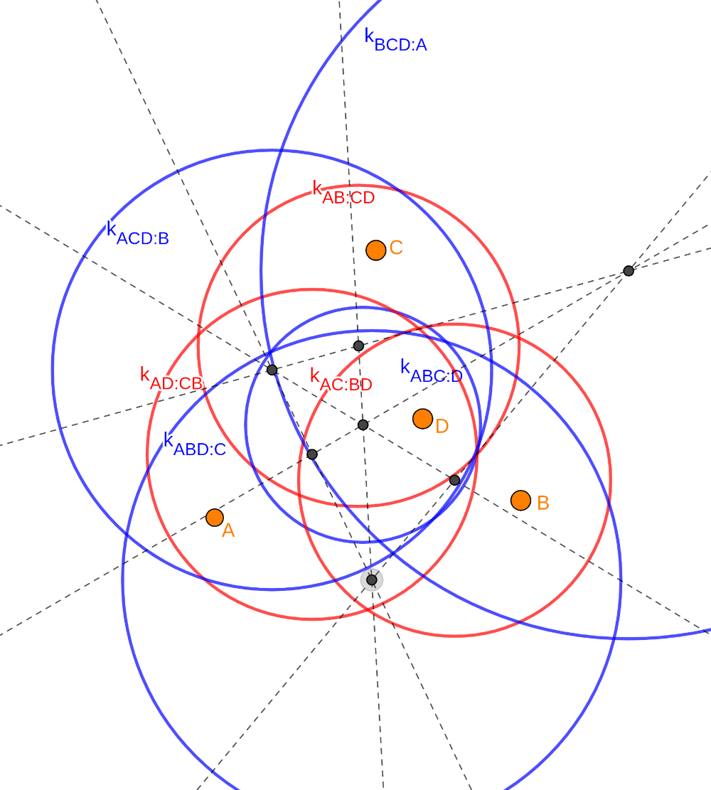 Az alábbi ábrán egy példát is mutatunk 4 pontra a 7 keresett körrel: a \(\displaystyle (2:2)\)-típusú körök pirossal, a \(\displaystyle (3:1)\)-típusú körök kékkel lettek megrajzolva, a szaggatott egyenesek a pontpárok felezőmerőlegesei.