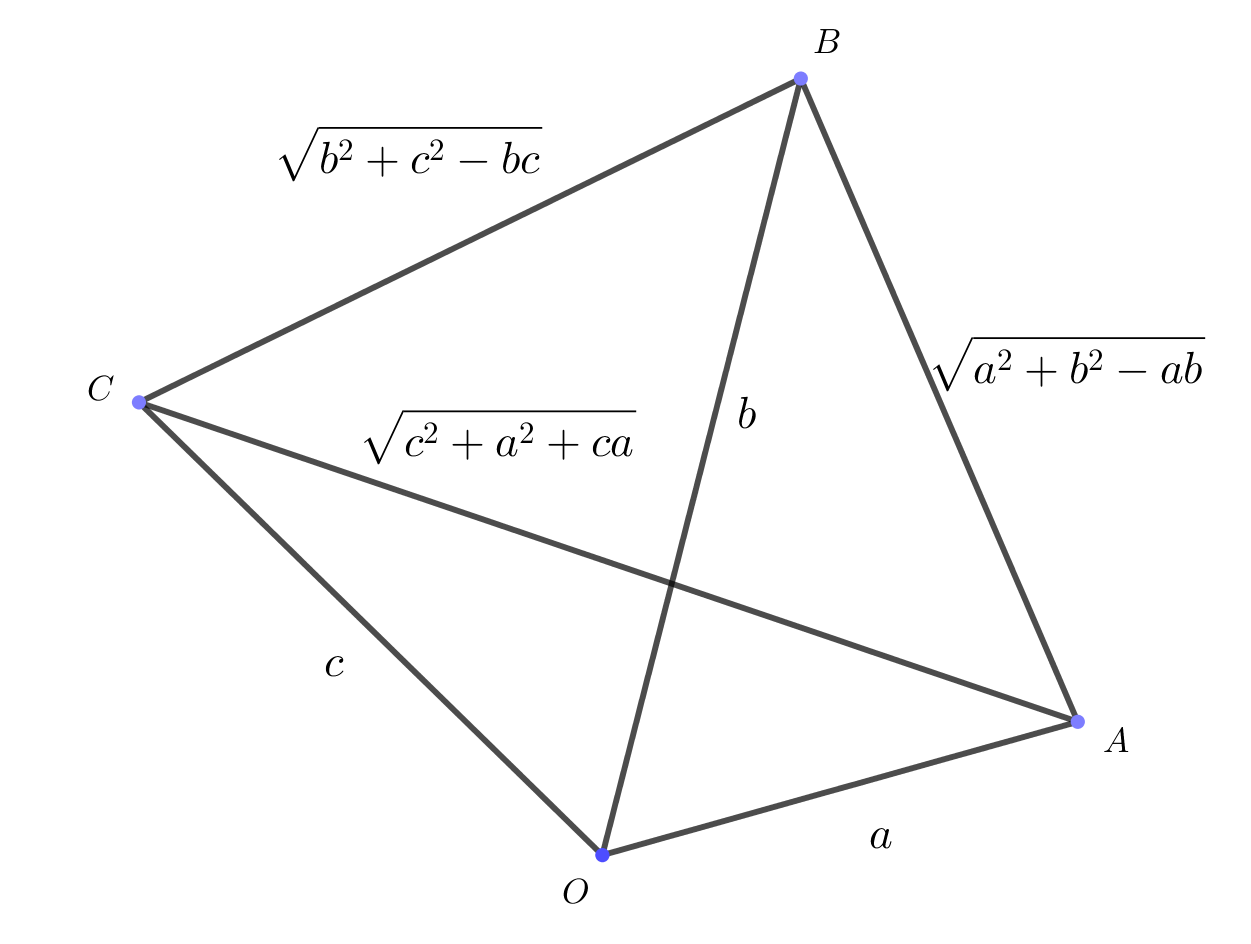 1. megoldás. Vegyük fel a közös kezdőpontú \(\displaystyle OA, OB, OC\) szakaszokat oly módon, hogy \(\displaystyle AOB\sphericalangle=BOC\sphericalangle=60^\circ\), továbbá a szakaszok hossza rendre \(\displaystyle OA=a, OB=b\) és \(\displaystyle OC=c\), az ábra szerint.