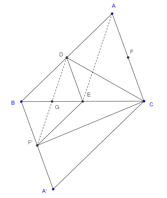 Megoldás. Legyen \(\displaystyle ABC\) az adott háromszög, továbbá \(\displaystyle AB, BC, CA\) oldalainak felezőpontjai rendre a \(\displaystyle D, E\) és \(\displaystyle F\) pontok. Tükrözzük a háromszöget a \(\displaystyle BC\) oldal \(\displaystyle E\) felezőpontjára. Az \(\displaystyle A\) csúcs tükörképe \(\displaystyle A'\), az \(\displaystyle F\) felezőpont tükörképe az \(\displaystyle F'\) pont az ábra szerint.