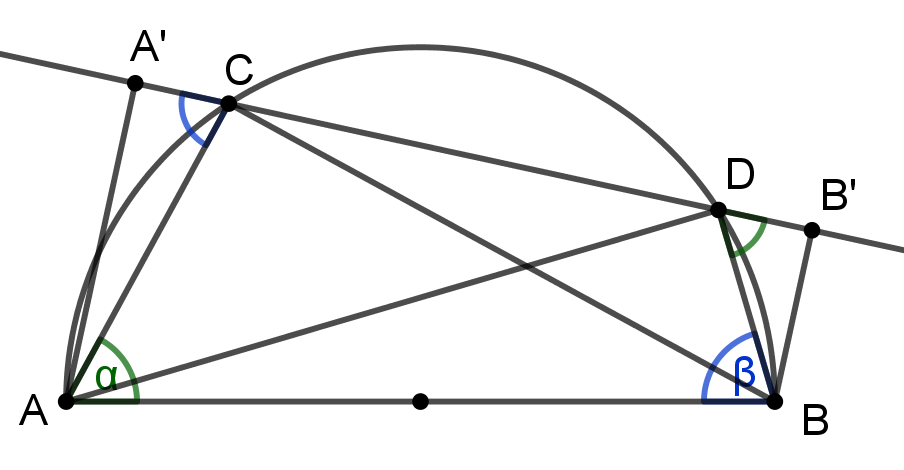 2. megoldás. A \(\displaystyle C\) és \(\displaystyle D\) pontok az \(\displaystyle AB\) átmérőjű félkör pontjai, \(\displaystyle ACDB\) húrnégyszög. A szemközti szögek összege \(\displaystyle 180^{\circ}\), \(\displaystyle CAB\sphericalangle=BDB'\sphericalangle=\alpha\). Az \(\displaystyle ACB\) és \(\displaystyle DB'B\) derékszögú háromszögek egy hegyesszöge ugyanakkora, a két háromszög hasonló. A megfelelő oldalak aránya alapján: