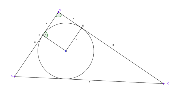 Megoldás. Használjuk a szokásos jelöléseket, legyenek a csúcsokból a beírt körhöz húzott érintőszakaszok \(\displaystyle x=s-a\), \(\displaystyle y=s-b\) és \(\displaystyle z=s-c\). Ekkor \(\displaystyle s=x+y+z\), valamint a jól ismert Héron-képlet a \(\displaystyle T=\sqrt{xyz(x+y+z)}\) alakot ölti. Felhasználjuk még az