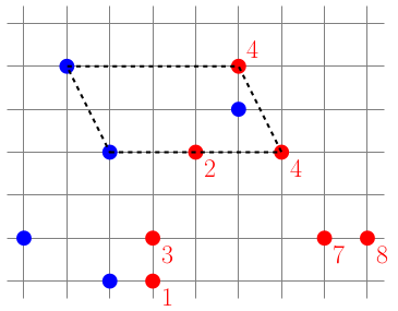 Tehát a skatulyaelv alapján lesz két különböző piros rácspont, amelyek mellé ugyanazt a számot írtuk (és ez a két rácspont nem lehet ugyanabban a sorban). Ekkor ez a két piros rácspont a soraikban levő kék rácspontokkal együtt egy paralelogrammát alkot, hiszen az egy sorban levő párokat összekötő szakaszok egyenlő hosszúak és párhuzamosak (mindegyik ,,vízszintes'', azaz párhuzamos az \(\displaystyle x\) tengellyel).