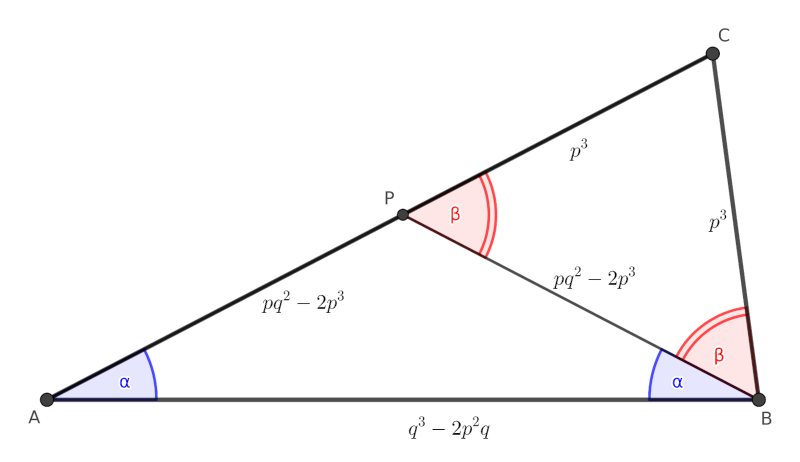 Vegyünk fel egy olyan \(\displaystyle APB\) háromszöget, amelyben \(\displaystyle AB = q^3-2p^2q\), míg