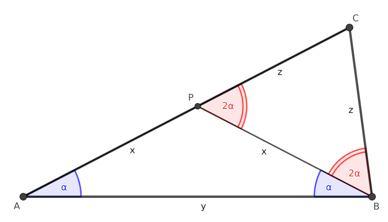 Húzzuk be \(\displaystyle AB\) felezőmerőlegesét, ez messe \(\displaystyle P\) pontban az \(\displaystyle AC\) oldalt. Ekkor egyrészt az \(\displaystyle ABP\) háromszög egyenlő szárú, így \(\displaystyle ABP \sphericalangle = \alpha\). Másrészt ekkor \(\displaystyle CBP \sphericalangle = BPA \sphericalangle = 2 \alpha\) (előbbit \(\displaystyle 3\alpha - \alpha\) külünbségként, utóbbit az \(\displaystyle ABP\) háromszög külső szögeként kapjuk), tehát a \(\displaystyle PBC\) háromszög is egyenlőszárú.
