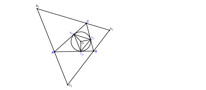 Megoldás. Az \(\displaystyle ABC\) háromszög beírt körének érintési pontjai \(\displaystyle A_0\), \(\displaystyle B_0\), \(\displaystyle C_0\), a beírt kör középpontja \(\displaystyle O\), a hozzáírt körök középpontjai \(\displaystyle A_1\), \(\displaystyle B_1\), \(\displaystyle C_1\); az \(\displaystyle A_0B_0C_0\), \(\displaystyle ABC\), \(\displaystyle A_1B_1C_1\) háromszögek körülírt körének sugara rendre \(\displaystyle R_0\), \(\displaystyle R\), illetve \(\displaystyle R_1\).