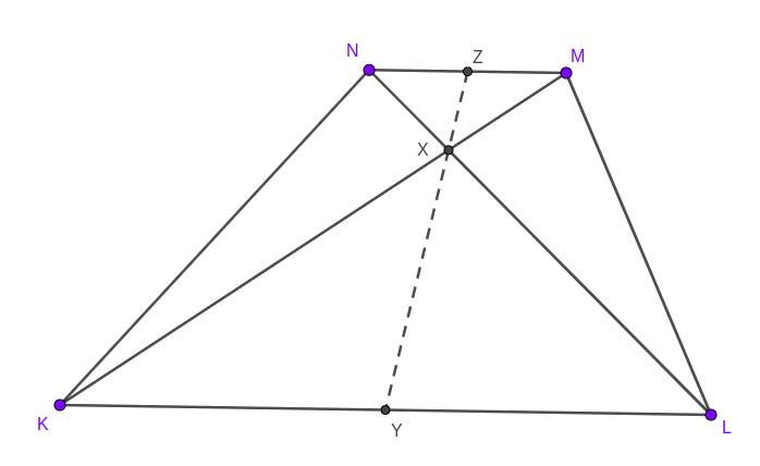 Segédállítás. Legyen a \(\displaystyle KLMN\) trapéz átlóinak metszéspontja \(\displaystyle X\), a \(\displaystyle KL\) és \(\displaystyle MN\) alapjainak felezőpontjai \(\displaystyle Y\) és \(\displaystyle Z\). Ekkor \(\displaystyle X\), \(\displaystyle Y\) és \(\displaystyle Z\) kollineárisak, továbbá a \(\displaystyle KNX\) és \(\displaystyle LMX\) háromszögek területe egyenlő.