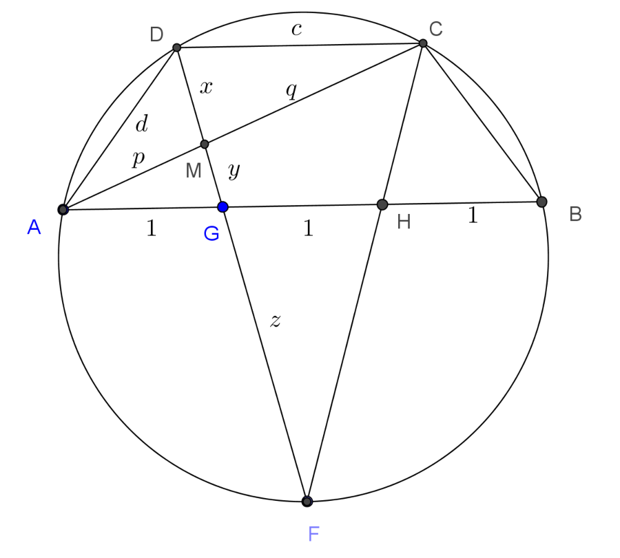 Az \(\displaystyle AC\) és \(\displaystyle DF\) szakaszok metszéspontja \(\displaystyle M\). Az \(\displaystyle AC\) szakaszt az \(\displaystyle M\) pont az \(\displaystyle AM=p\) és \(\displaystyle MC=q\) hosszúságú szakaszokra osztja, továbbá az \(\displaystyle M\) és \(\displaystyle G\) pontok a \(\displaystyle DF\) szakaszt \(\displaystyle x\), \(\displaystyle y\) és \(\displaystyle z\) hosszúságú részekre; \(\displaystyle DM=x\), \(\displaystyle MG=y\), \(\displaystyle GF=z\). A szokásos jelölésekkel a trapéz \(\displaystyle CD\) alapja \(\displaystyle c\), \(\displaystyle AD\) szára pedig \(\displaystyle d\).