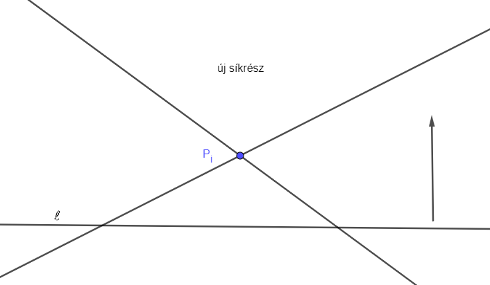 Most képzeletben seperjünk végig az \(\displaystyle \ell\) egyenessel a \(\displaystyle P_1\), \(\displaystyle P_2\), \(\displaystyle \ldots\), \(\displaystyle P_k\) pontokon, vagyis toljuk el párhuzamosan \(\displaystyle \ell\)-t folytonosan addig, míg az összes \(\displaystyle P_1\), \(\displaystyle P_2\), \(\displaystyle \ldots\), \(\displaystyle P_k\) pont át nem kerül \(\displaystyle \ell\) másik oldalára. Az \(\displaystyle \ell\) speciális választása miatt a \(\displaystyle P_1\), \(\displaystyle P_2\), \(\displaystyle \ldots\), \(\displaystyle P_k\) pontokon egyesével ,,haladunk át''. Egy ábrával könnyen meggyőződhetünk róla, hogy minden egyes ilyen áthaladáskor \(\displaystyle \ell\) elhagy egy korábban metszett síkrészt, és helyette egy új síkrészbe metsz bele.