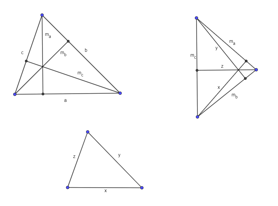 Ugyanezt a gondolatot megismételhetjük az \(\displaystyle m_a\), \(\displaystyle m_b\) és \(\displaystyle m_c\) oldalakkal szerkesztett háromszögre is, amelynek területét jelöljük \(\displaystyle T_1\)-gyel: \(\displaystyle 2T_1=m_ax=m_by=m_cz\).