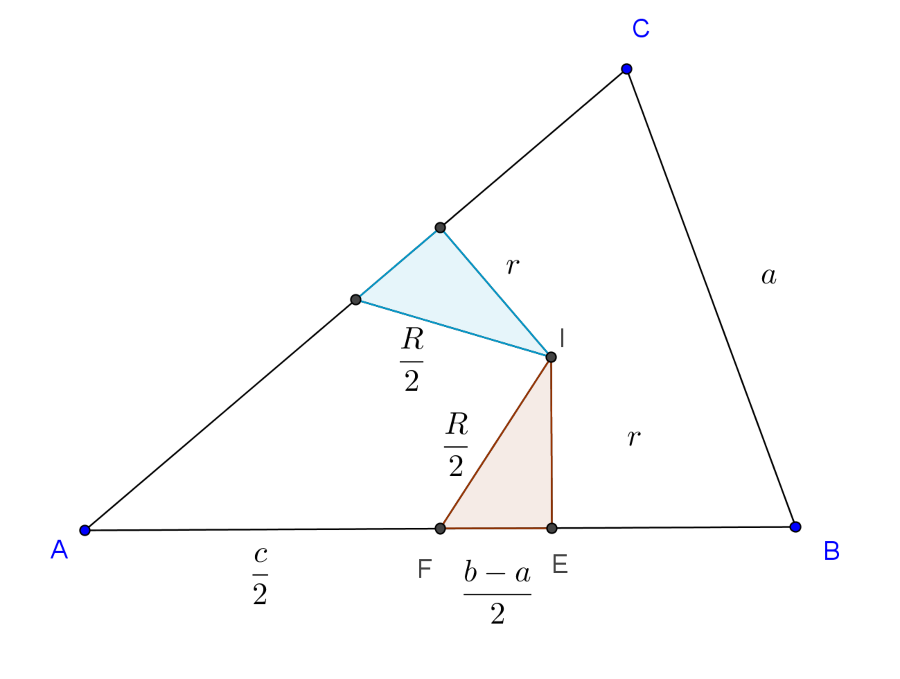 Most vegyük észre, hogy a felezőpont és az érintési pont közé eső szakaszok mind egy-egy olyan derékszögű háromszög befogói, amelyeknek harmadik csúcsa az \(\displaystyle I\) pont, s így átfogója a Feuerbach-kör \(\displaystyle R/2\) sugara, másik befogója pedig a beírt kör \(\displaystyle r\) sugara (lásd az ábrán színezett háromszögeket). Így ez a három háromszög egybevágó, következésképp oldalaik páronként egyenlőek, amiből