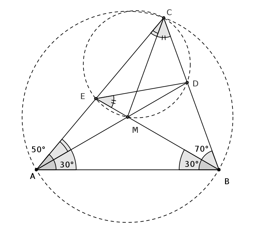 Mivel \(\displaystyle BAC\sphericalangle=50^\circ\) és \(\displaystyle ABC\sphericalangle=70^\circ\), a háromszög harmadik szöge \(\displaystyle ACB\sphericalangle=60^\circ\), és így \(\displaystyle ECD\sphericalangle=60^\circ\). Az \(\displaystyle ABM\) egyenlő szárú háromszögben \(\displaystyle AMB\sphericalangle=120^\circ\), és így ezen szög csúcsszögére, a \(\displaystyle DME\sphericalangle\)-re is teljesül, hogy a nagysága \(\displaystyle 120^\circ\). Azaz a \(\displaystyle DCEM\) négyszög két szemközti (\(\displaystyle C\)-nél és \(\displaystyle M\)-nél) lévő szögének összege \(\displaystyle 180^{\circ}\), vagyis \(\displaystyle DCEM\) húrnégyszög és köré kör rajzolható.