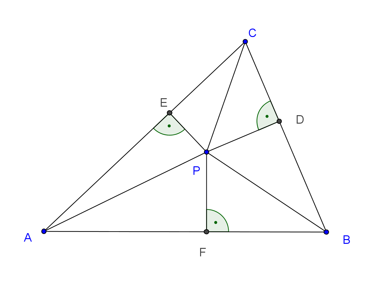 B. 5371. Legyen \(\displaystyle P\) pont az \(\displaystyle ABC\) háromszög belső pontja. Jelölje a \(\displaystyle P\) pont merőleges vetületét a \(\displaystyle BC\), \(\displaystyle CA\) és \(\displaystyle AB\) oldalakra rendre \(\displaystyle D\), \(\displaystyle E\) és \(\displaystyle F\). Bizonyítsuk be, hogy
