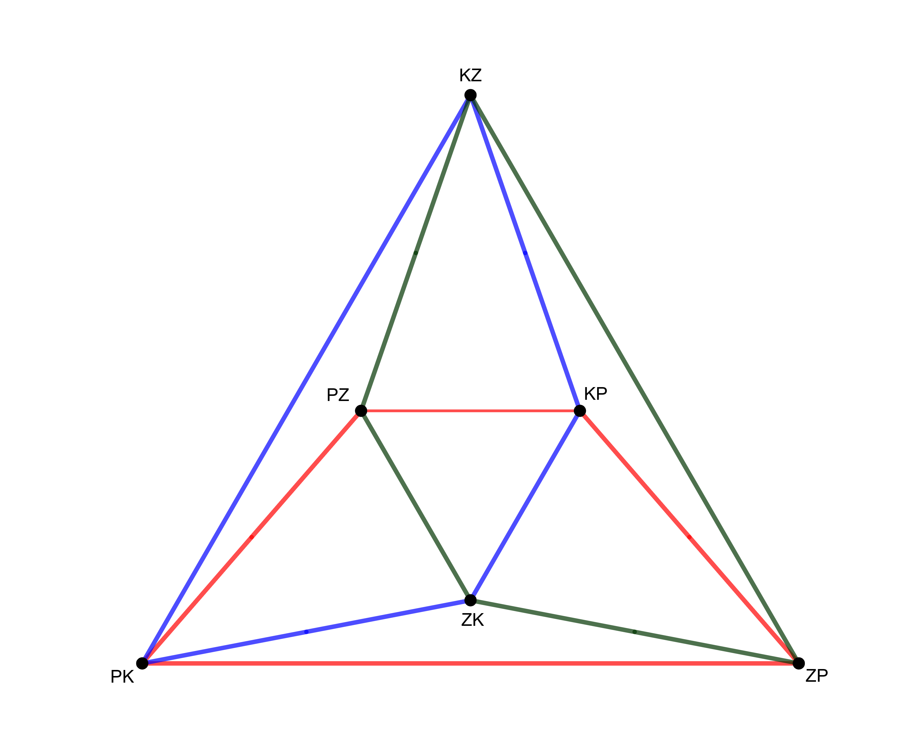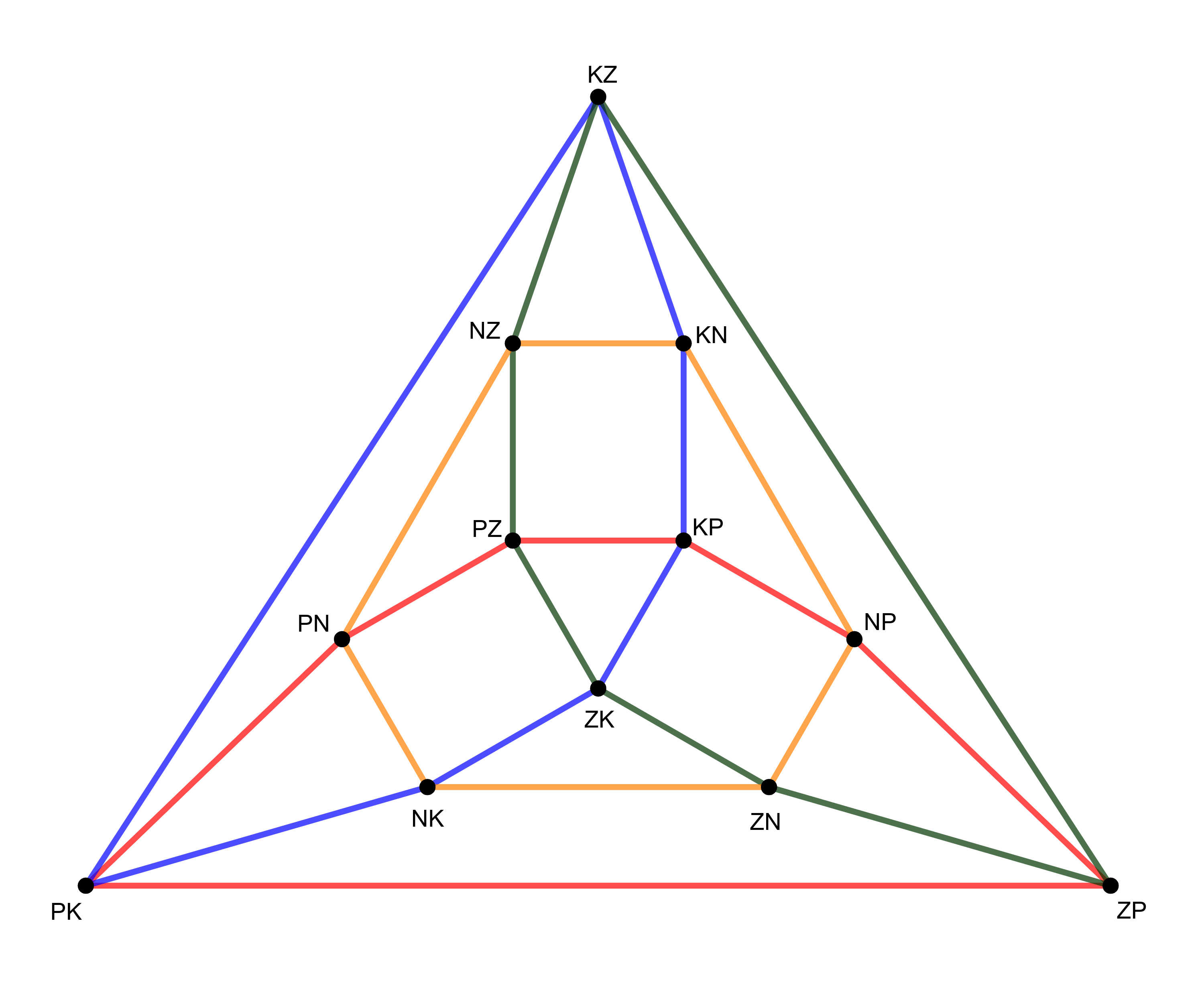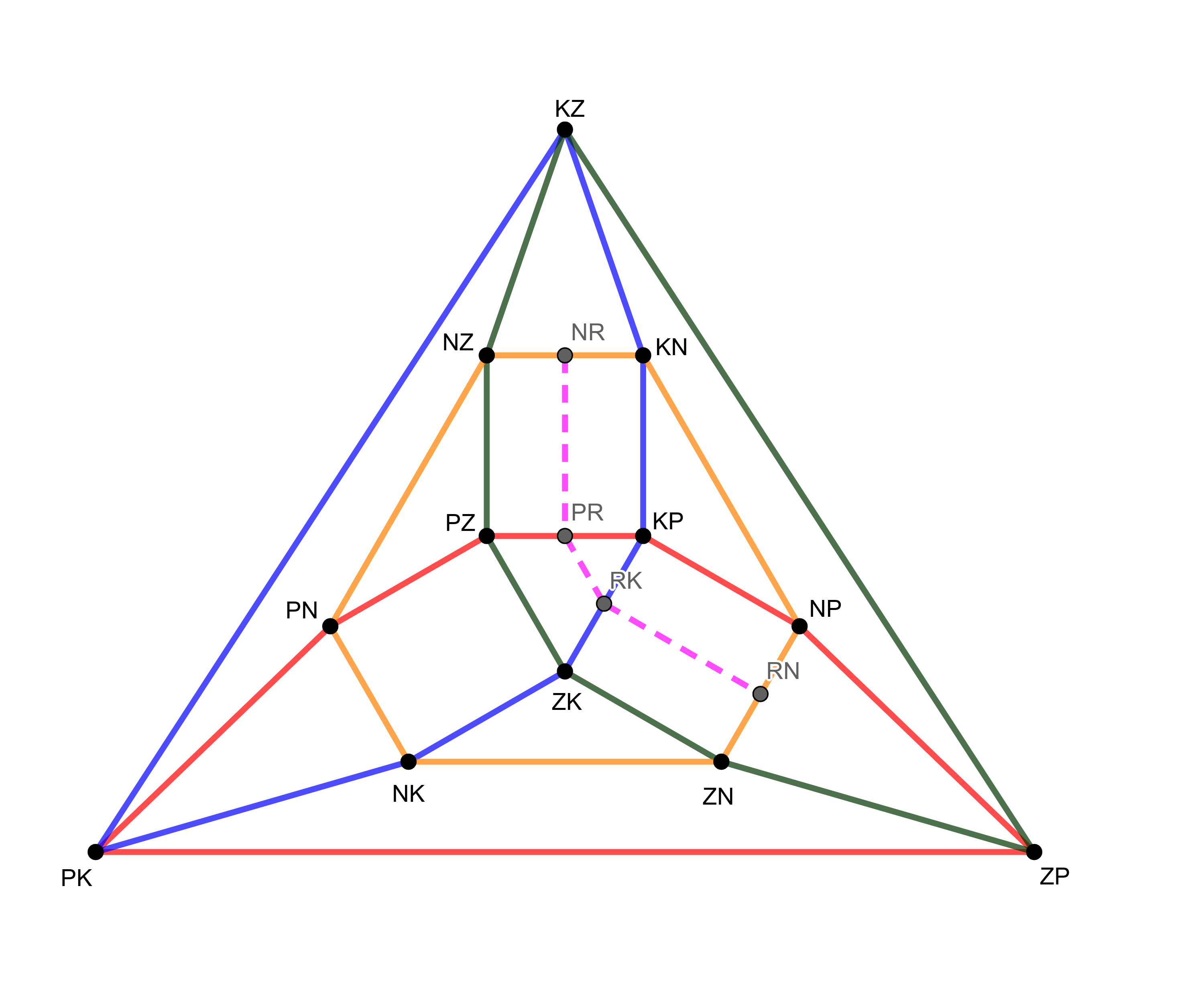 Az általánosság korlátozása nélkül feltehetjük (a kuboktaéder élgráfjának szimmetriája miatt), hogy az ötödik főkör metszi a fenti ábránkon a középső (\(\displaystyle PZ-KP-ZK\)) háromszöget, méghozzá a piros és kék élét szétvágva. Ha nem keletkezett ötszög, akkor az új főkörnek a négyszögeket mindig szembenlevő oldalpárban kell metszenie. Így az ötödik főkör egy részét berajzolhatjuk a kuboktaéder-élgráfos ábránkra (rózsaszín szaggatott):