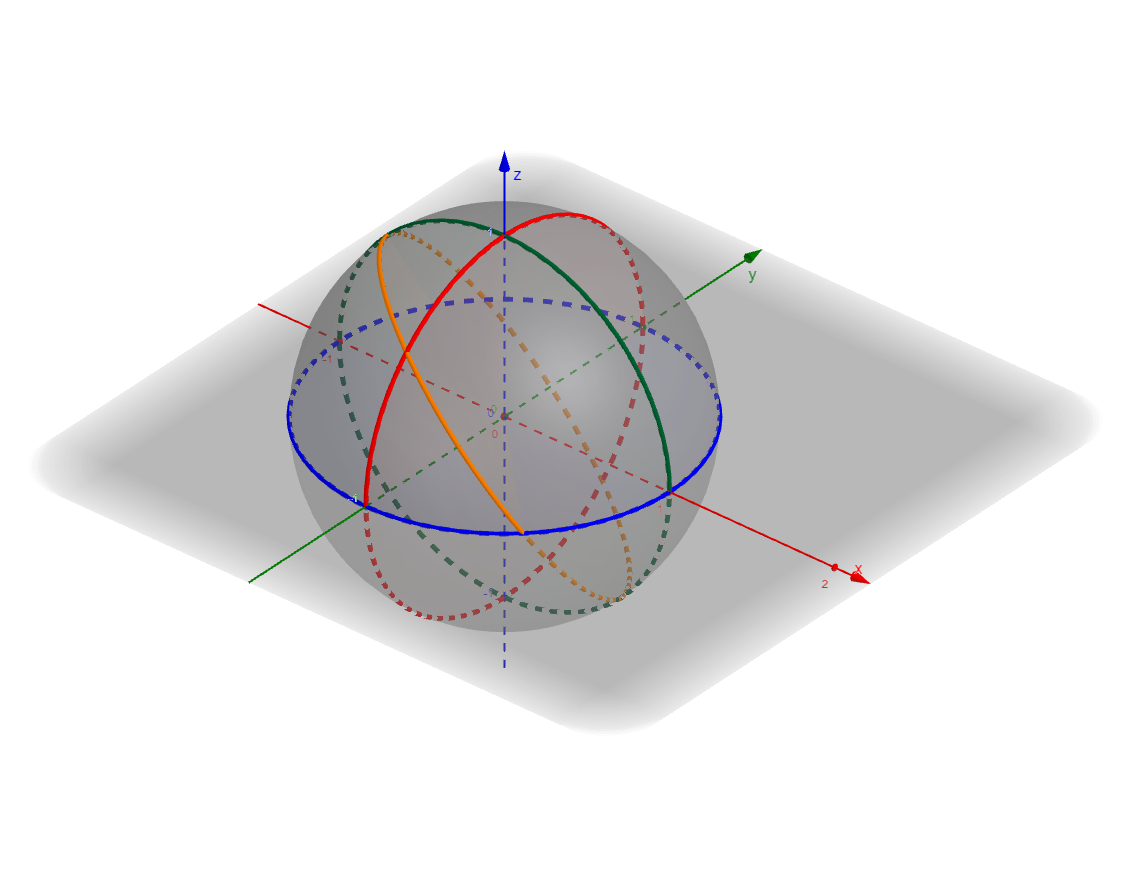 Egy viszonylag jól áttekinthető ábrát kapunk, ha tekintjük az \(\displaystyle x^2+y^2+z^2 = 1\) egyenletű gömböt és ezen az \(\displaystyle x=0\), \(\displaystyle y=0\), \(\displaystyle z=0\) és \(\displaystyle x+y+z = 0\) egyenletű síkok által kimetszett főköröket.