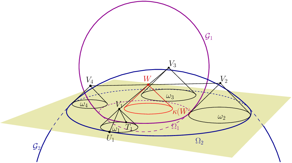 Most megmutatjuk, hogy a \(\displaystyle V_1V_3\) és \(\displaystyle V_2V_4\) szakaszok egy síkban fekszenek. Illesszük az \(\displaystyle \Omega_1\) körre a \(\displaystyle \mathcal{G}_1\), az \(\displaystyle \Omega_2\)-re a \(\displaystyle \mathcal{G}_2\) gömböt úgy, hogy ezek \(\displaystyle 45^\circ\)-os szögben messék az alapsíkot, \(\displaystyle \mathcal{G}_1\) középpontja az alapsík fölött, \(\displaystyle \mathcal{G}_2\) középpontja a sík alatt legyen. Legyen \(\displaystyle \omega_i\) és \(\displaystyle \Omega_1\) érintési pontja \(\displaystyle T_i\), az \(\displaystyle \omega_i\) és \(\displaystyle \Omega_2\) érintési pontja pedig \(\displaystyle U_i\). Az \(\displaystyle \omega_i\)-re emelt kúp \(\displaystyle V_iT_i\) alkotója érinti \(\displaystyle \mathcal{G}_1\)-et, míg ugyanennek a kúpnak a \(\displaystyle V_iU_i\) alkotója érinti \(\displaystyle \mathcal{G}_2\)-t. A \(\displaystyle V_i\) csúcsból tehát ugyanolyan hosszú érintőt lehet húzni a két gömbhöz, tehát mindegyik \(\displaystyle V_i\) csúcs a két gömb hatványsíkjában van.