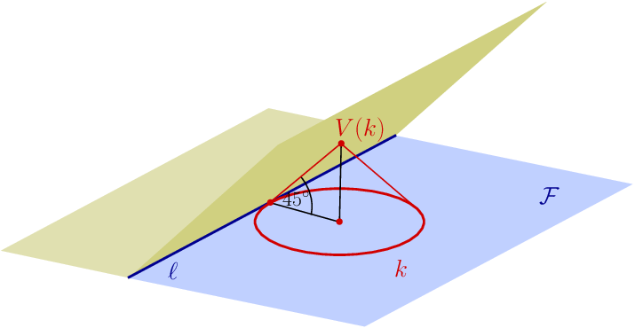 Szükségünk lesz a következő egyszerű észrevételre. Tegyük fel, hogy az alapsíkban adott egy \(\displaystyle \ell\) határú \(\displaystyle \mathcal{F}\) félsík, és vizsgáljuk azokat a \(\displaystyle k\) köröket, amelyek \(\displaystyle \mathcal{F}\)-ben fekszenek, és érintik \(\displaystyle \ell\)-et. Látható, hogy az összes ilyen körökhöz tartozó \(\displaystyle V(k)\) pontok halmaza egy félsík, ami illeszkedik \(\displaystyle \ell\)-re, az \(\displaystyle \mathcal{F}\)-fel \(\displaystyle 45^\circ\)-os szöget zár be, és persze az alapsík felső oldalán van.