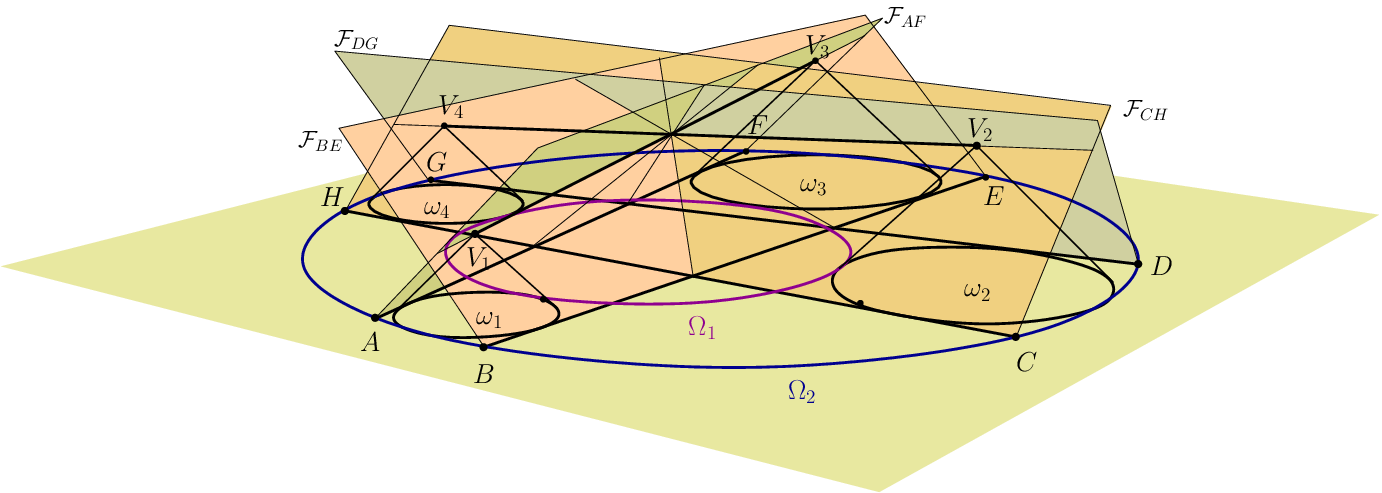 Legyen \(\displaystyle V_1=V(\omega_1)\), \(\displaystyle V_2=V(\omega_2)\), \(\displaystyle V_3=V(\omega_3)\), illetve \(\displaystyle V_4=V(\omega_4)\). Mivel \(\displaystyle \omega_1\) és \(\displaystyle \omega_3\) a belső oldalon érinti az \(\displaystyle AF\) és a \(\displaystyle BE\) egyenest, az \(\displaystyle \mathcal{F}_{AF}\) és \(\displaystyle \mathcal{F}_{BE}\) félsíkoknak \(\displaystyle V_1\) és \(\displaystyle V_3\) is közös pontja, ezért mindkét félsík tartalmazza a \(\displaystyle V_1V_3\) szakaszt. Hasonlóan, az \(\displaystyle \mathcal{F}_{CH}\) és a \(\displaystyle \mathcal{F}_{DG}\) félsík is tartalmazza a \(\displaystyle V_2V_4\) szakaszt.