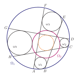 B. 5381. Adott az \(\displaystyle \Omega_1\) körbe írt \(\displaystyle ABCDEFGH\) nyolcszög, és \(\displaystyle \Omega_1\) belsejében az \(\displaystyle \Omega_2\) kör. Tegyük fel, hogy az \(\displaystyle \omega_1\), \(\displaystyle \omega_2\), \(\displaystyle \omega_3\), \(\displaystyle \omega_4\) körök kívülről érintik \(\displaystyle \Omega_2\)-t, továbbá \(\displaystyle \omega_1\) belülről érinti az \(\displaystyle \Omega_1\) kör \(\displaystyle AB\) ívét, az \(\displaystyle AF\) és a \(\displaystyle BE\) szakaszt; \(\displaystyle \omega_2\) belülről érinti a \(\displaystyle CD\) ívet, a \(\displaystyle CH\) és a \(\displaystyle DG\) szakaszt; \(\displaystyle \omega_3\) belülről érinti az \(\displaystyle EF\) ívet, az \(\displaystyle AF\) és a \(\displaystyle BE\) szakaszt; végül \(\displaystyle \omega_4\) belülről érinti a \(\displaystyle GH\) ívet, a \(\displaystyle CH\) és a \(\displaystyle DG\) szakaszt az ábra szerint. Mutassuk meg, hogy az \(\displaystyle AF\), \(\displaystyle BE\), \(\displaystyle CH\) és \(\displaystyle DG\) szakaszok által bezárt négyszögbe kört lehet írni.