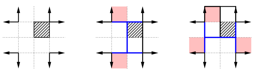 – Ha a lefedő dominó a jelölt mezőt és a tőle délre lévő mezőt fedi le (középső ábra), akkor a jelölt mezőtől észak-nyugatra lévő, pirossal jelölt mező nem fedhető le olyan függőleges dominóval, aminek a piros mező az északi mezeje, mert ekkor az alakzat ,,északi'' ágában lévő lefedetlen maradéka páratlan mezőt tartalmazna. Hasonló okokból a középső ábra másik pirossal jelölt mezője sem fedhető le olyan függőleges dominóval, aminek a piros mező a déli mezeje. Ekkor (középső) ábránkon dominószélekből kialakul az ábrán kékkel megrajzolt (elforgatott) H betű.