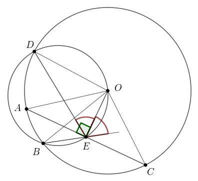 Az \(\displaystyle BEOD\) körben \(\displaystyle BO=DO\) miatt a \(\displaystyle BO\) és \(\displaystyle OD\) ívek egyenlők, ezért \(\displaystyle OE\) a \(\displaystyle BED\) szög külső szögfelezője. A külső szögfelezőre merőleges, a szög csúcsán átmenő \(\displaystyle AEC\) egyenes tehát a \(\displaystyle BED\) szög belső szögfelezője.