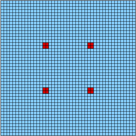 2. megoldás. Bontsuk fel a nagy négyzetet egységnégyzetekre. Számozzuk meg a sorokat és az oszlopokat \(\displaystyle 1\)-től \(\displaystyle 45\)-ig, és színezzük pirosra azt a \(\displaystyle 16\) kis négyzetet, amelyeknek mindkét koordinátája \(\displaystyle 15\), \(\displaystyle 16\), \(\displaystyle 30\) vagy \(\displaystyle 31\).