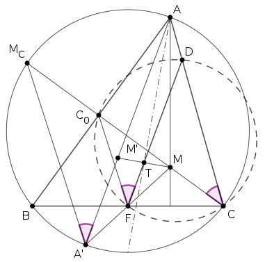 Másrészt az \(\displaystyle ABC\) körben azonos íven nyugvó kerületi szögek, tehát \(\displaystyle AA'M_C\sphericalangle = ACM_C\sphericalangle = DCC_0\sphericalangle \). Kaptuk, hogy \(\displaystyle DFC_0\sphericalangle=DCC_0\sphericalangle\), azaz \(\displaystyle F\) és \(\displaystyle C\) a \(\displaystyle C_0D\) ugyanazon látókörívén van, amiből az állítás következik.