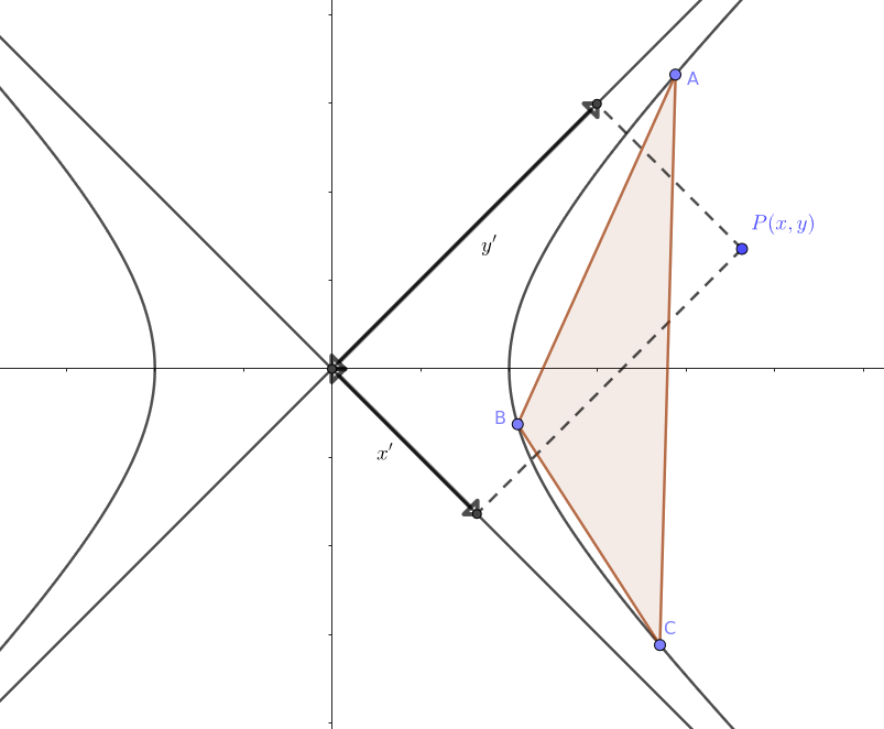 B. 5493. Írjunk fel olyan, a síkvektorokhoz nemnegatív számokat rendelő \(\displaystyle f\) függvényt, amelyre teljesül, hogy bármely, az \(\displaystyle x^2-y^2=1\) hiperbolába írt \(\displaystyle ABC\) háromszög területe \(\displaystyle f\Big(\overrightarrow{AB}\Big)\cdot f\Big(\overrightarrow{BC}\Big)\cdot f\Big(\overrightarrow{CA}\Big)\).