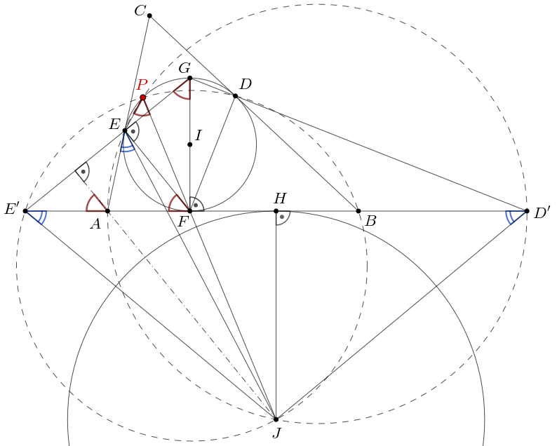 Megoldás. Legyen az \(\displaystyle AB\) oldalhoz hozzáírt kör középpontja \(\displaystyle J\), érintési pontja az \(\displaystyle AB\) egyenesen \(\displaystyle H\), a \(\displaystyle JF\) egyenes és a beírt kör második metszéspontja \(\displaystyle P\ne F\). Azt állítjuk, hogy az \(\displaystyle AED'\) és \(\displaystyle BDE'\) körök átmennek a \(\displaystyle J\) és a \(\displaystyle P\) pontokon, utóbbi bizonyítja a feladat állítását.