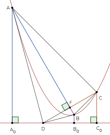 A parabola definíciója szerint \(\displaystyle AF=AA_0\), \(\displaystyle BF=BB_0\) és \(\displaystyle CF=CC_0\), továbbá jól ismert, hogy az \(\displaystyle AD\) és \(\displaystyle BD\) érintők felezik az \(\displaystyle A_0AF\sphericalangle\), illetve a \(\displaystyle B_0BF\sphericalangle\) szöget, így az \(\displaystyle F\) tükörképe az \(\displaystyle AD\) és \(\displaystyle BD\) érintőkre \(\displaystyle A_0\), illetve \(\displaystyle B_0\). Tehát \(\displaystyle AA_0DF\) és \(\displaystyle BB_0DF\) is derékszögű deltoid.