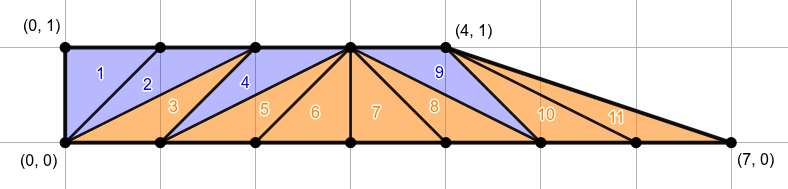 Megoldás. Mivel a felbontásban szerepelő háromszögek minden csúcsának \(\displaystyle y\) koordinátája 0 vagy 1, ezért a háromszögek kétfélék lehetnek: