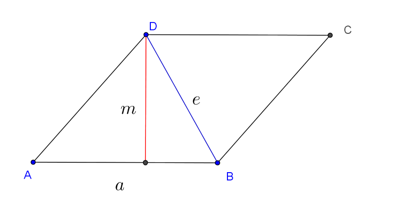 Megoldás. Legyen a szóban forgó oldal \(\displaystyle a\), a megmért átló \(\displaystyle e\), továbbá az \(\displaystyle a\) oldalhoz tartozó magasság \(\displaystyle m\). A paralelogramma területét az oldal és a hozzátartozó magasság szorzata adja. Esetünkben:
