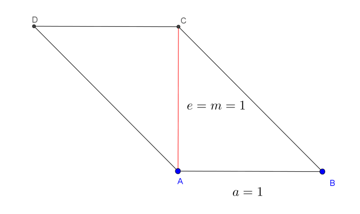 Az egyenlőséghez két dolog is szükséges. Egyrészt a magasságnak meg kell egyeznie az átlóval, ez akkor következik be, amikor az átló merőleges az oldalra, másrészt az oldalnak és a magasságnak is meg kell egyeznie, emiatt \(\displaystyle a=m=e=1\).