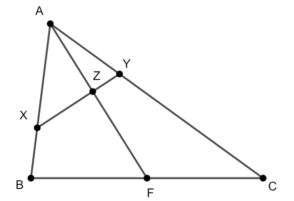 B. 5524. Az \(\displaystyle ABC\) háromszögben \(\displaystyle F\) a \(\displaystyle BC\) oldal felezőpontja. Egy egyenes az \(\displaystyle AB\), \(\displaystyle AC\), \(\displaystyle AF\) szakaszokat rendre az \(\displaystyle X\), \(\displaystyle Y\), \(\displaystyle Z\) pontokban metszi. Bizonyítsuk be, hogy