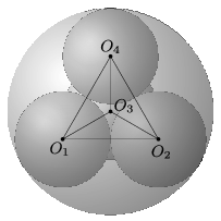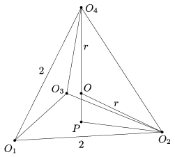 Megoldás. Legyen a nagy gömb középpontja \(\displaystyle O\), a kis gömböké \(\displaystyle O_1\), \(\displaystyle O_2\), \(\displaystyle O_3\), \(\displaystyle O_4\). A négy középpont egy szabályos tetraéder négy csúcsa (1. ábra). A tetraéder köré gömb írható és nyilván ezen gömb középpontja egybeesik a nagy gömb \(\displaystyle O\) középpontjával.