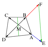 Megoldás. \(\displaystyle M\)-ből a csúcsokba mutató vektorok legyenek a jelöléseknek megfelelően \(\displaystyle \mathbf a, \mathbf b, \mathbf c, \mathbf d\). Így \(\displaystyle \overrightarrow{ME}=\mathbf a - \mathbf c\) és \(\displaystyle \overrightarrow{MF}=\mathbf b - \mathbf d\), ahonnan \(\displaystyle \overrightarrow{FE}=\mathbf a - \mathbf c - \mathbf b + \mathbf d\). Az \(\displaystyle AD\) szakasz felezőpontjába mutató vektor \(\displaystyle \frac 12(\mathbf a + \mathbf d)\), a \(\displaystyle BC\) szakasz felezőpontjába mutató vektor \(\displaystyle \frac 12(\mathbf b + \mathbf c)\), így az első felezőpontból a másodikba mutató vektor - melynek tartóegyenese a felezőpontok által meghatározott középvonal egyenese - \(\displaystyle \frac 12(\mathbf a + \mathbf d - \mathbf b - \mathbf c)=\frac 12 \overrightarrow{FE}\).