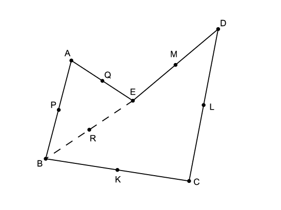 Az \(\displaystyle ABE\) háromszögben a \(\displaystyle P\), \(\displaystyle Q\), és \(\displaystyle R\) pontok oldalfelező pontok, így a középvonalak miatt az \(\displaystyle APQR\) négyszög paralelogramma. Az \(\displaystyle RKLM\) négyszög szintén paralelogramma, mert egy négyszög oldalainak felezőpontjai paralelogrammát határoznak meg.