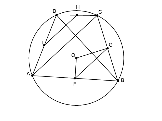 \(\displaystyle DIH\angle=DAC\angle\) és \(\displaystyle DHI\angle=DCA\angle\), mert egyállású szögek. \(\displaystyle DAC\angle=DBC\angle\) a kerületi szögek tétele miatt, \(\displaystyle DBC\angle=OGF\angle\), mert merőleges szárú szögek (hiszen \(\displaystyle FG\parallel AC\), és \(\displaystyle AC\perp DB\), illetve egy kör középpontját egy húr felezőpontjával összekötő szakasz merőleges a húrra). Hasonlóan \(\displaystyle DCA\angle=DBA\angle\) és \(\displaystyle DBA\angle=OFG\angle\).