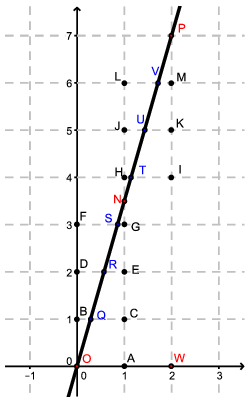 Megoldás. Tekintsük az ábrát. Látható, hogy elég az \(\displaystyle OP\) szakasz pontjait vizsgálni, hiszen az elhelyezkedés ismétlődik. Itt pedig elég a fekete pontoknak az egyenestől való távolságát vizsgálni. Mindegyik távolság egy derékszögű háromszög átfogóhoz tartozó magassága: az \(\displaystyle A\) ponté az \(\displaystyle OAN\), a \(\displaystyle B\) ponté a \(\displaystyle BCN\) stb., a \(\displaystyle H\) ponté a \(\displaystyle THN\), az \(\displaystyle I\) ponté a \(\displaystyle TIP\) stb., az \(\displaystyle M\) ponté a \(\displaystyle VMP\) háromszög magassága. Ezek a háromszögek mind hasonlók egymáshoz, hiszen derékszögűek, és egyik hegyeszögük is megegyezik, hiszen tangense mindegyik esetben \(\displaystyle 7/2\). Hasonló háromszögek közül annak a megfelelő magassága a legkisebb, amelyiknek a hosszabbik befogója a legkisebb a háromszögek közül. Ez a mi esetünkben az \(\displaystyle SGN\) és a \(\displaystyle THN\) háromszög, melyek hosszabbik befogója 1/2, vagyis az \(\displaystyle OWP\) háromszög befogójának 14-ede. Az \(\displaystyle OWP\) háromszög területének kétszerese: \(\displaystyle 2t=2\cdot7=\sqrt{2^2+7^2}\cdot m\), amiből \(\displaystyle m=\frac{14}{\sqrt{53}}\). A keresett távolság ennek a 14-ed része, vagyis \(\displaystyle \frac{1}{\sqrt{53}}\).