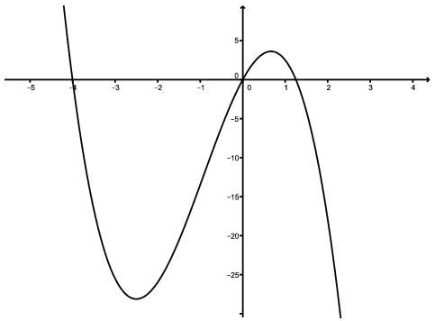 A három szám szorzata: \(\displaystyle abc=a(2,5-2a)(a+4)=-2a^3-5,5a^2+10a\). Vizsgáljuk ezt a kifejezést függvényként, melyet jelöljön \(\displaystyle f(a)\). A függvény zérushelyei \(\displaystyle a_1=0\), \(\displaystyle a_2=1,25\) és \(\displaystyle a_3=-4\).