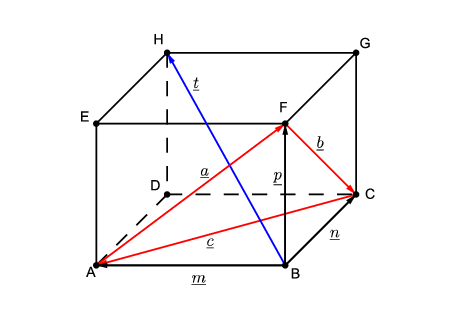 Legyen \(\displaystyle \overrightarrow{BA}=\underline{m}\), \(\displaystyle \overrightarrow{BC}=\underline{n}\) és \(\displaystyle \overrightarrow{BF}=\underline{p}\), valamint a három vektor hossza legyen rendre \(\displaystyle m\), \(\displaystyle n\) és \(\displaystyle p\).