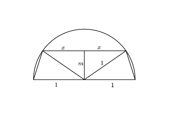 Megoldás. A hulladék pontosan akkor minimális, ha a kapott trapéz területe maximális. A trapéz húrtrapéz, egyik alapja a kör átmérője, így hossza 2. Magasságát \(\displaystyle m\)-mel, a másik alap hosszát \(\displaystyle 2x\)-szel jelölve felírható az ábrán látható derékszögű háromszögre a Pitagorasz-tétel: \(\displaystyle m^2+x^2=1\), amiből \(\displaystyle x=\sqrt{1-m^2}\).