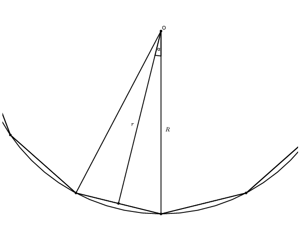 Megoldás. Jelölje a körülírt kör sugarát \(\displaystyle R\), a beírt körét \(\displaystyle r\). Tekintsünk egy, a sokszög egyik oldalának végpontjai és a körök közös középpontja által meghatározott háromszöget. A két sugár által bezárt szöget jelölje \(\displaystyle \alpha\).