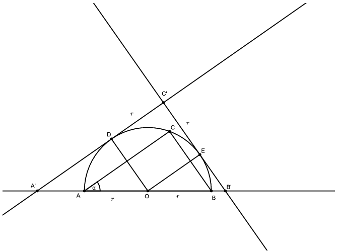 Legyen az \(\displaystyle O\) pontból a \(\displaystyle B'C'\), illetve az \(\displaystyle A'C'\) oldalra állított merőleges talppontja rendre \(\displaystyle E\), illetve \(\displaystyle D\), ekkor \(\displaystyle E\) és \(\displaystyle D\) az érintési pontok, így \(\displaystyle OE=OD=r\) és \(\displaystyle A'C'B'\angle=90^{\circ}\) miatt \(\displaystyle OEC'D\) négyzet. Tehát \(\displaystyle DC'=DO=r\).