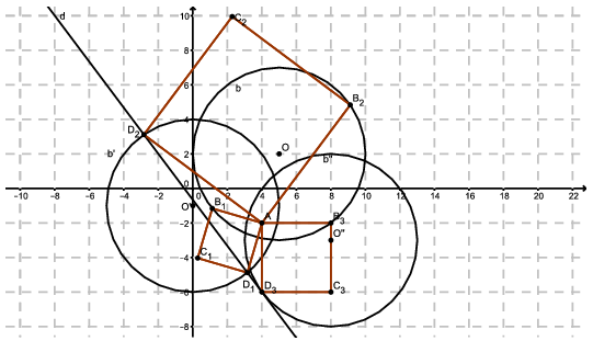 vagyis innen \(\displaystyle x=4\), amiből \(\displaystyle y=-\frac43\cdot4-\frac23=-6\). Tehát azt kaptuk, hogy \(\displaystyle D_3(4;-6)\). Ekkor a négyzet oldala 4 egység hosszú, a másik két csúcs koordinátái egyszerűen megkaphatók: \(\displaystyle B_3(8;-2)\) és \(\displaystyle C_3(8;-6)\).