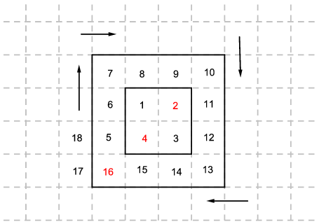 Megoldás. Az ábrán bejelölt négyzetek oldala 2, illetve 4 hosszú, a bal alsó mezőben \(\displaystyle 2^2\), illetve \(\displaystyle 4^2\) áll. Ha a számozást folytatjuk, akkor a páros négyzetszámok sorban a következő négyzet bal alsó mezőjébe kerülnek.