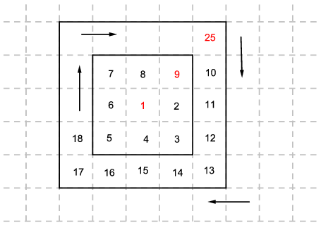Hasonlóan, a következő ábrán a páratlan négyzetszámok vannak pirossal megjelölve, azok mindig a soron következő négyzet jobb felső sarkába kerülnek.